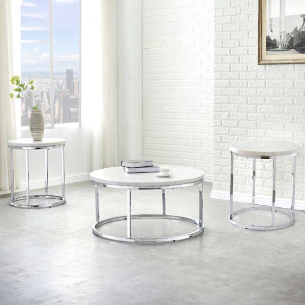 Round center table set along with shiny stainless steel base. The beautiful modern stainless steel center table set which have the plain beautiful white marble at the top of the center table. New amazing look with one big & two small side table for home decor.